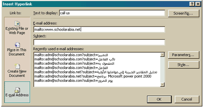 - الربط ببريد الكتروني : 1. قم بكتابة النص الذي يمثل الربط بعنوان بريدك الالكتروني وذلك ضمن الصفحة التي تريدها ، مثل عبارة Call us . 2. حدد النص في اختر Hyperlink من القائمة Insert . 3. يظهر مربع Insert Hyperlink ثم اختار E-mail Address من الشريط Link to . 4. ادخل عنوان بريدك الالكتروني في المربع النصي E-mail Address . 5. انقر