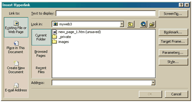 - الربط بصفحة على الانترنت : 1. حدد النص أو الرسم الذي تريد ربطه . 2. اختر Hyperlink من القائمة Insert . 3. يظهر مربع Insert Hyperlink قم بإدخال عنوان الصفحة التي تريد الربط بها وذلك في خانة المربع Address .