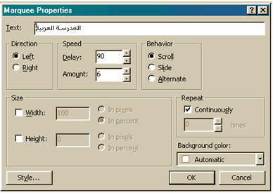 إضافة زر تصويب Hover Button : زر التصويب هو عنصر جاهز يشكل ربط يأتي على شكل زر ، يتم تشغيل مؤثر تحريك منه عند وضع مؤشر الماوس فوقه . 1. انقر ربط Hyperlink الذي تريد تحويله إلى زر تصويب نقرة مزدوجة ليتم اختياره . 2. اختر Web Component من القائمة Insert واختر Hover Button من القائمة Choose an effect . 3. اختر الزر Finish ، فيظهر مربع حوار خصائص زر التصويب . 4. حدد الخصائص الذي تريدها ثم انقر الزر Ok .