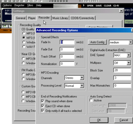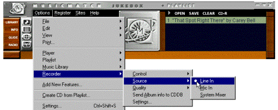 الأمر الآخر، هو الحاجة إلى برمجية قادرة على تسجيل الصوت الذي يأتي من خلال منفذ الدخول في بطاقة الصوت. من أفضل البرمجيات وأسهلها استعمالا هو ميوزيك ماتش MusicMatch Jukebox، لهذا البرنامج استعمالات كثيرة مفيدة، والأهم هو أنه يمكنك الحصول عليه مجانا من الإنترنت. قم بتنزيل وتركيب هذا البرنامج في كمبيوترك.