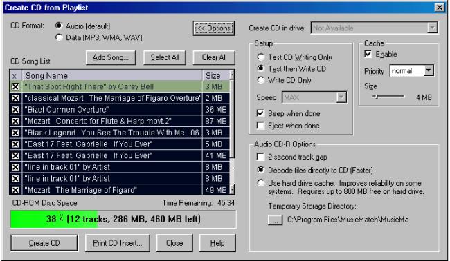 في الجزء الأيمن من نافذة برنامجMusicMatch Jukebox  تجد قائمة التسجيلات. ولكي تنسخ أغنية أو مقطوعة موسيقية لداخل هذه القائمة يمكنك استعمال الماوس لسحب أي ملف من مكتبة الموسيقى إلى هذه النافذة. هذا وبشكل عام فإن قرص التسجيل السي دي يمكنه احتواء 74 دقيقة من الموسيقى. (برنامج MusicMatch لا يتعامل حاليا مع قرص التسجيل الجديد الذي مدتة 80 دقيقة).